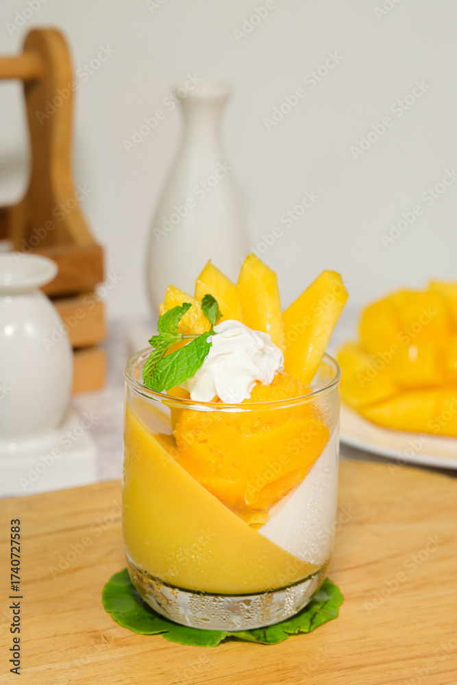 Mango Delight: A delectable mango dessert, with layers of creamy texture, topped with fresh mango slices and mint leaf, creating an appetizing treat.