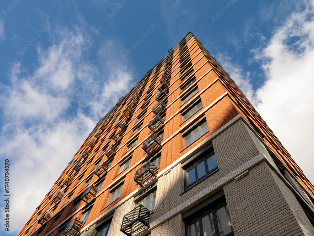 Dynamic perspective of a modern building corner with a combined red and beige brick facade, representing contemporary urban architecture and real estate development.