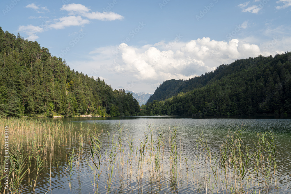 Calm lake surrounded by lush forests and mountains on a clear sunny day in the afternoon