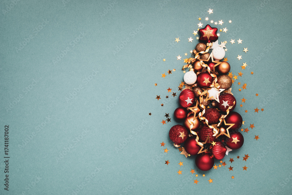 Christmas and New Year tree from holiday decoration balls top view. Festive ornament composition for celebration.