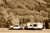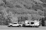 Pickup truck with travel trailer on scenic country road with stunning view of colorful fall foliage on the mountain hill. Autumn landscape in Colorado, USA. Road trip and camping journey
