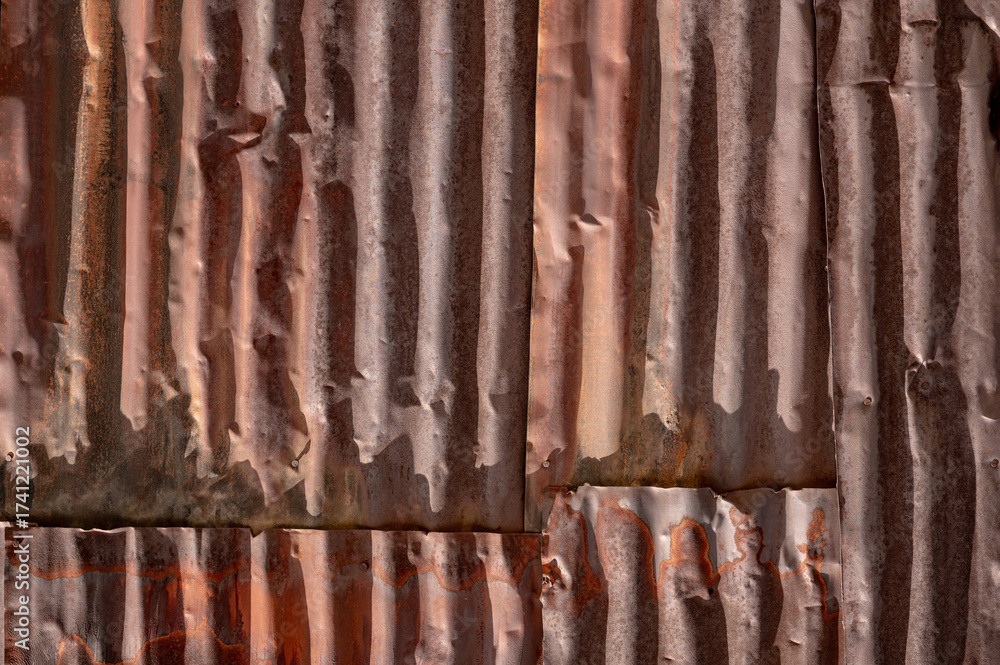 Old rusty zinc panel wall texture. Weathered galvanized steel sheet fence. Rustic material background for retro concept