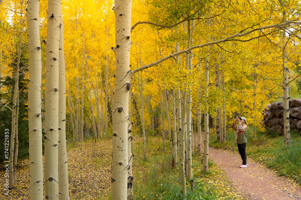 Tourist woman capturing a beautiful shot while walking on trail in yellow aspen forest during peak fall foliage. Explore autumn landscape and embrace nature in Telluride, Colorado, United States.