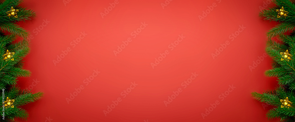 Christmas backdrop, empty copy space red background. Fir tree border with lights. Beautiful holiday frame.