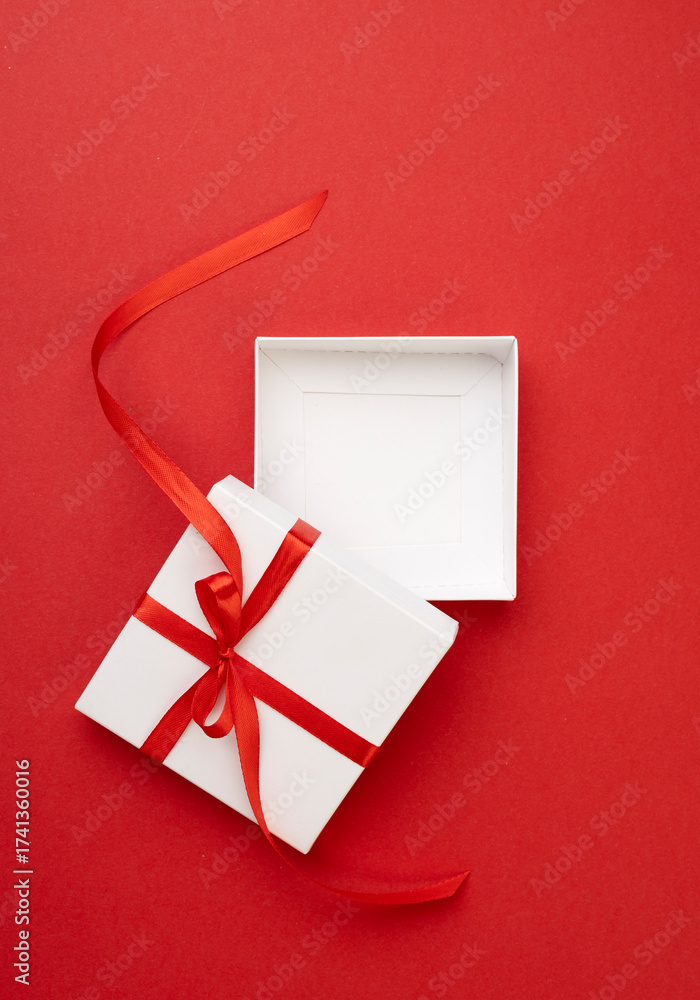 Single white opened square gift box decorated with red ribbon top view empty advertisement space. Present unboxed product promotion template, vertical display.