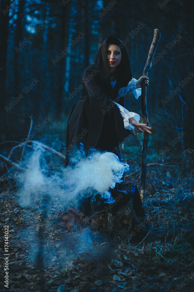 Halloween Young beautiful and mysterious woman witch in woods, in black cloak with hood, witch conjures in the wizarding forest