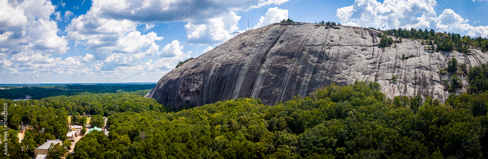 Massive granite dome of Stone Mountain rising above green Georgia forest