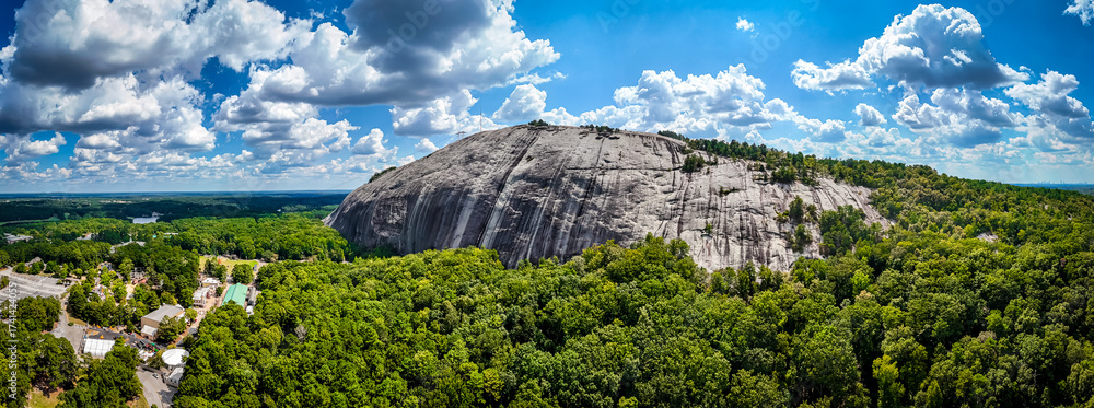 Massive granite dome of Stone Mountain rising above green Georgia forest