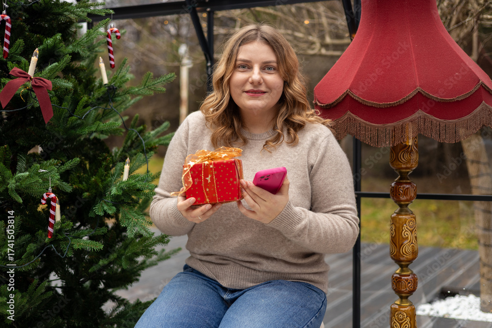 Young beautiful woman sitting near decorated Christmas tree in living room on sofa, smiling and using phone, typing message on smartphone, celebrating new year and Christmas. Holiday banner