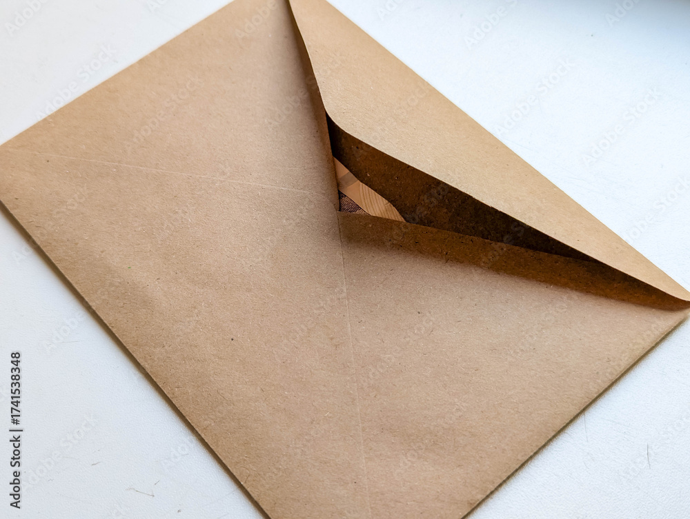 Brown recycled paper envelope with visible flap detail photographed at angle on white surface emphasizing sustainable correspondence concept. High quality photograph