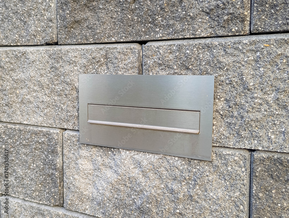 Warsaw, Poland, September 20, 2025. Brushed metal mailbox slot embedded in gray stone brick wall architectural detail of residential building entrance feature. High quality photograph