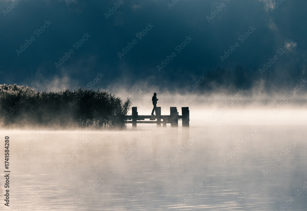 early morning at the lake in autumn with fog