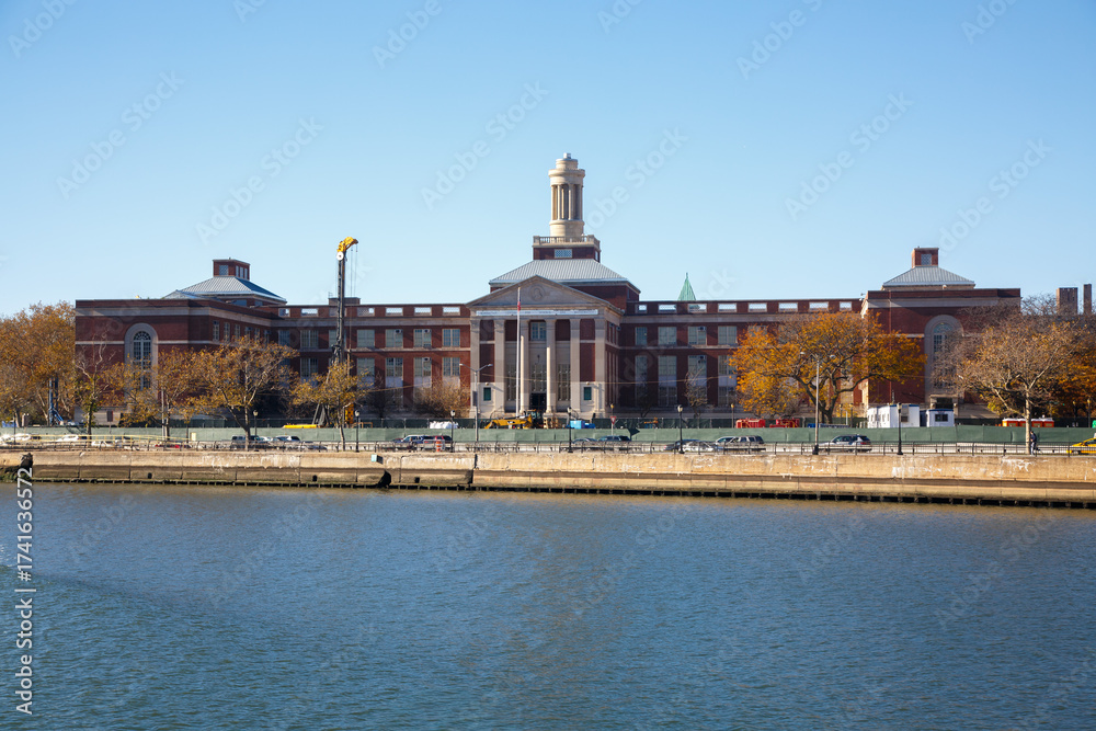 Manhattan Center for Science and Mathematics (MCSM) school and the skyline of Harlem, manhattan at the shore of Harlem river, New York City, United States