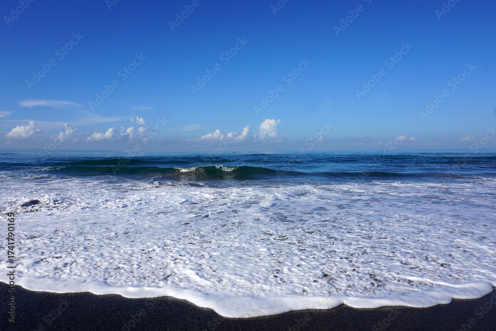 Blue sky and the wave on black sand beach. Sea sand and blue sky background. Natural beach landscape background with white wave foam flow.