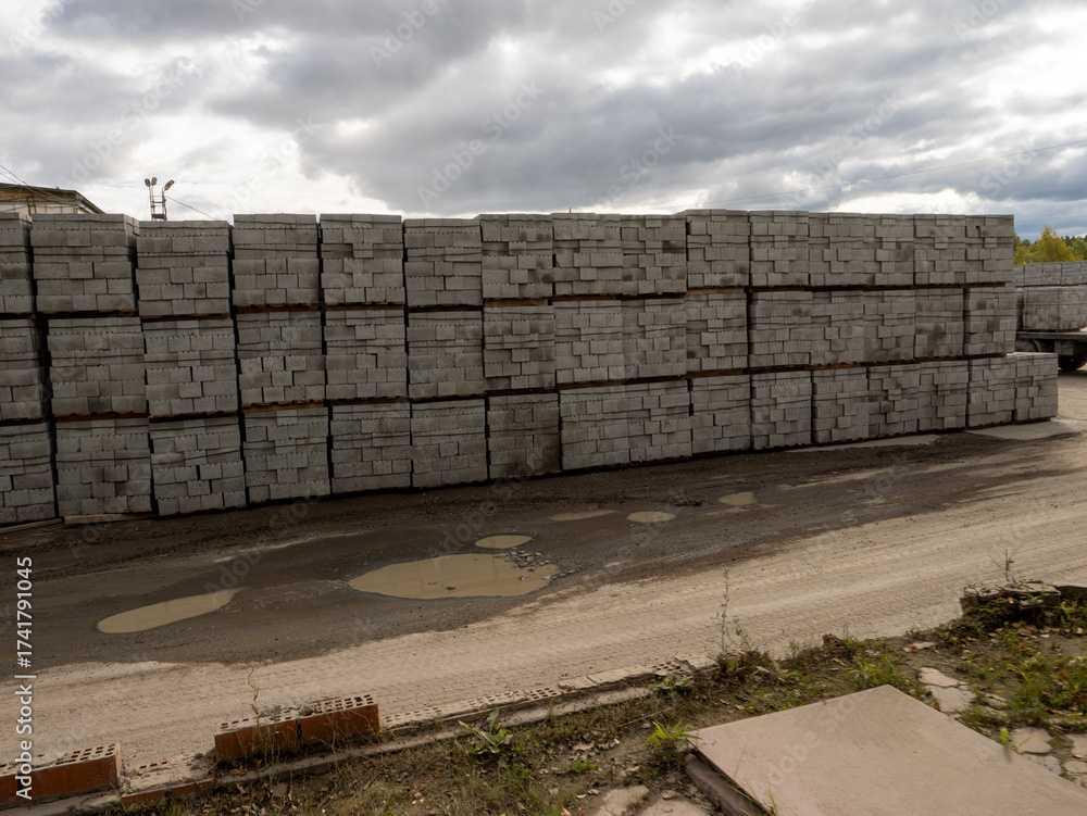 A large stack of concrete blocks is arranged neatly in a storage yard. The sky is overcast with gray clouds, and a wet surface is visible on the ground.