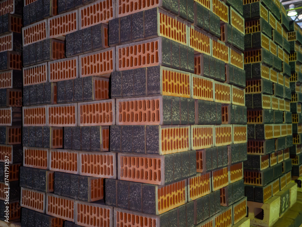 A stack of red and gray bricks arranged neatly in a warehouse. The bricks are of various designs, showcasing their texture and color variations.