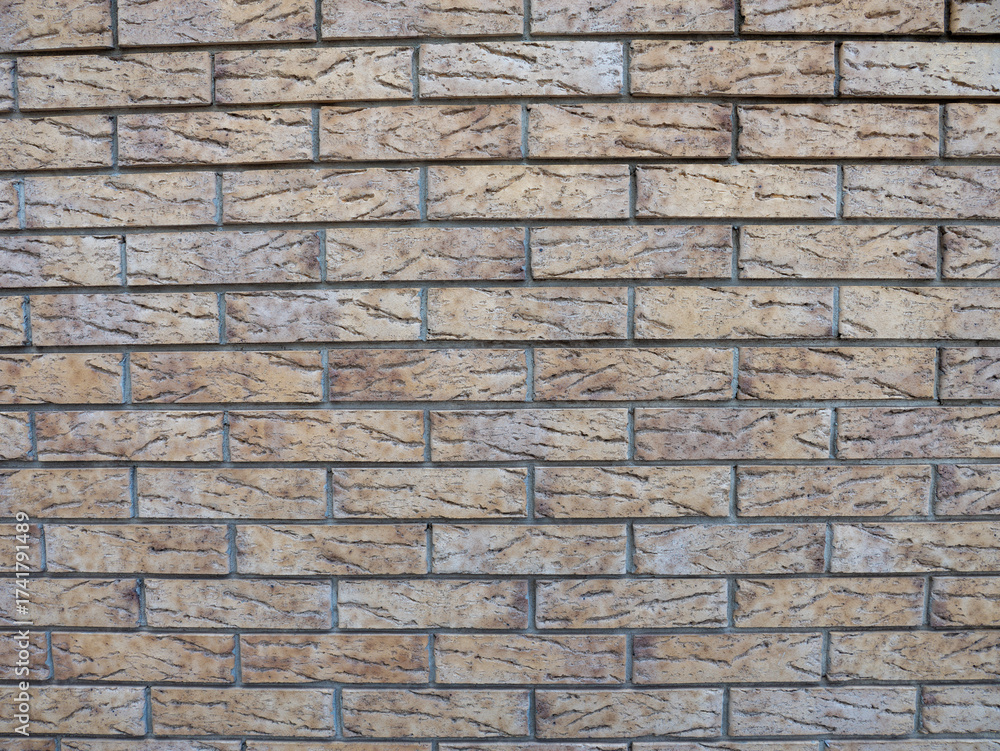 A textured wall made of rectangular beige bricks arranged in a uniform pattern. The surface shows subtle variations in color and texture.
