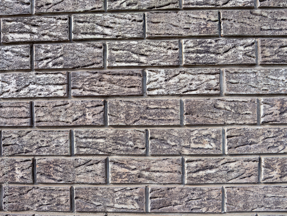 A textured gray brick wall with a rough surface. The bricks are arranged in a traditional pattern, showcasing various shades of gray and subtle variations in texture.