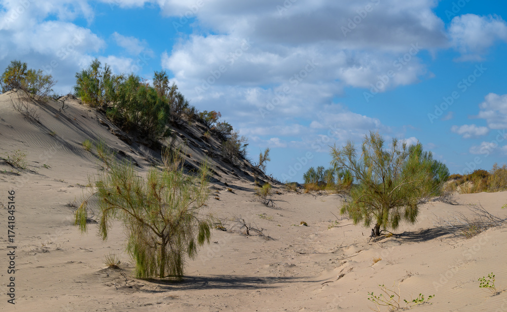 A sand dune and cloudy sky in the desert area of Almaty region in southeastern Kazakhstan.
