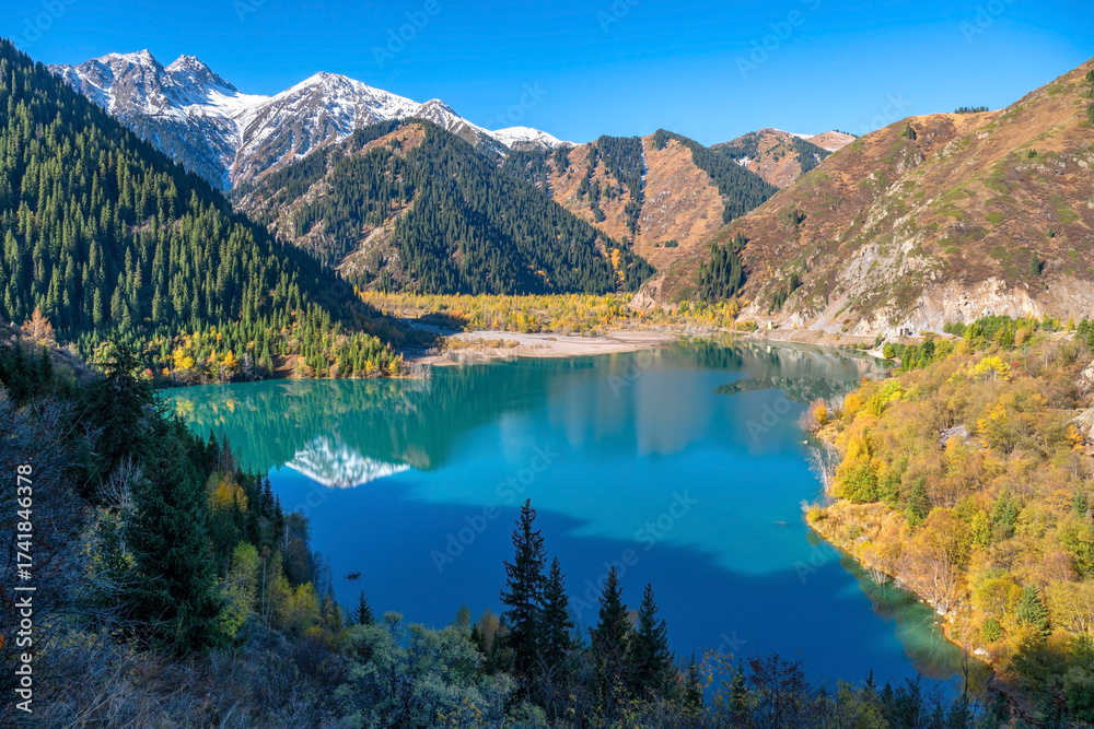 Aerial view of picturesque Lake Issyk in the Trans-Ili Alatau Mountains in southeastern Kazakhstan on an autumn morning