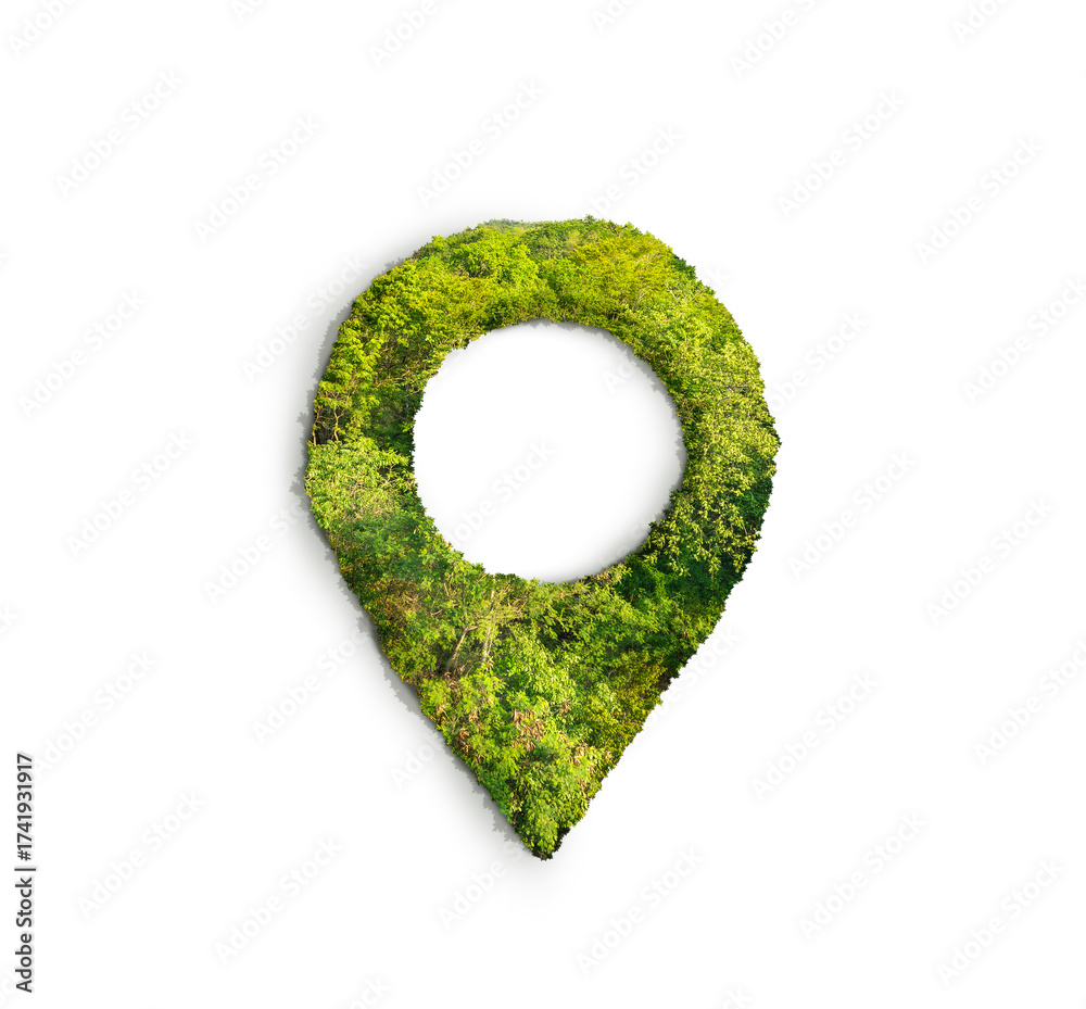 Green location symbol of pin. A green forest shape on location pin concept of green place for tourist or visit. Green Destination. Environment day concept. World Forestry Day.