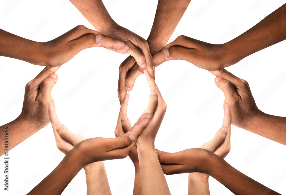 Business groups Unity and diversity partnership as hands in a group of 2 diverse people community connected together shaped as two support circles symbol of team or teamwork and togetherness.