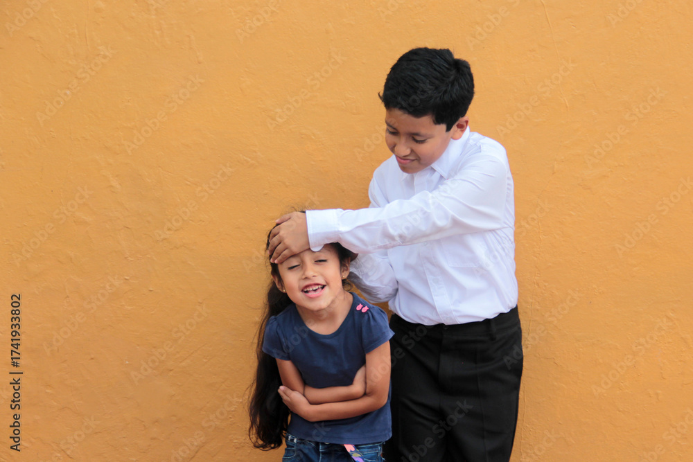 Dark-haired older brother and Latina younger sister play and tease each other as a family to celebrate Children's Day