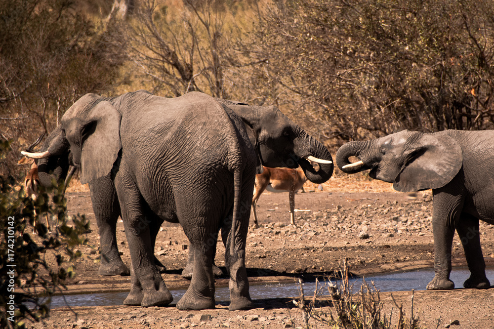 African elephant breeding herd socialising at a waterhole amid the dry winter growth