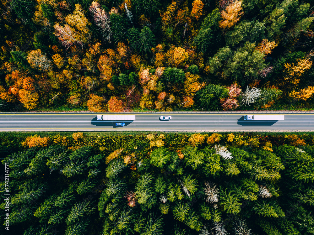 Aerial drone view of asphalt road with cars and cargo trucks and colorful fall autumn forest in rural Finland. Logistic and delivery concept.