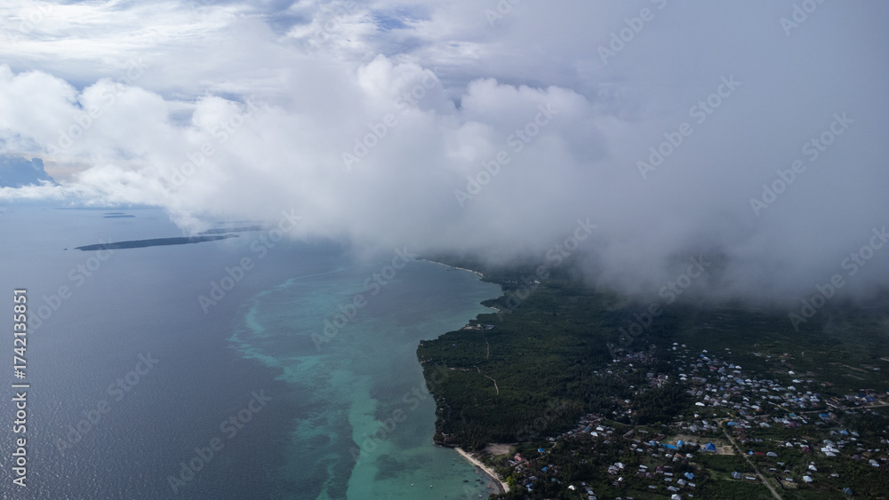 Overcast aerial view of a tropical island with lush vegetation and turquoise water