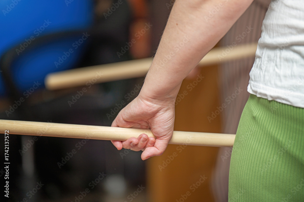 A woman's hand holding a smooth wooden gymnastics bar during a home workout with children
