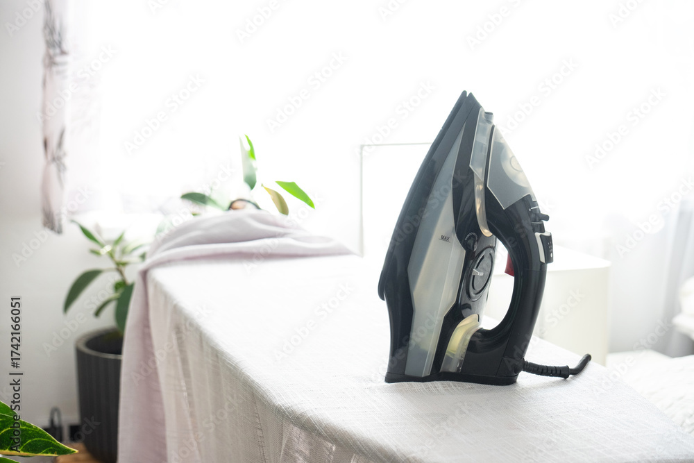 The iron is on the ironing board with a plain cloth in the room in close-up.