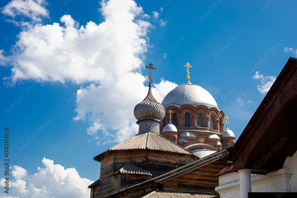 Beautiful domes of ancient churches in Kazan. Sunny summer day. Beautiful church architecture.