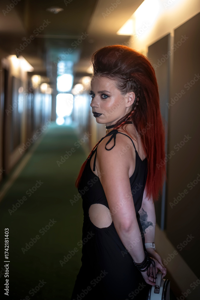 A punk girl with a beautiful mohawk. Red hair. A girl in a black dress on the street. Sunny summer day.