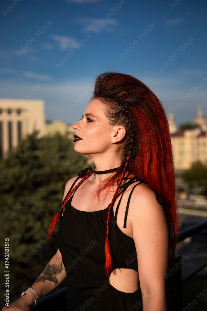 A punk girl with a beautiful mohawk. Red hair. A girl in a black dress on the street. Sunny summer day.