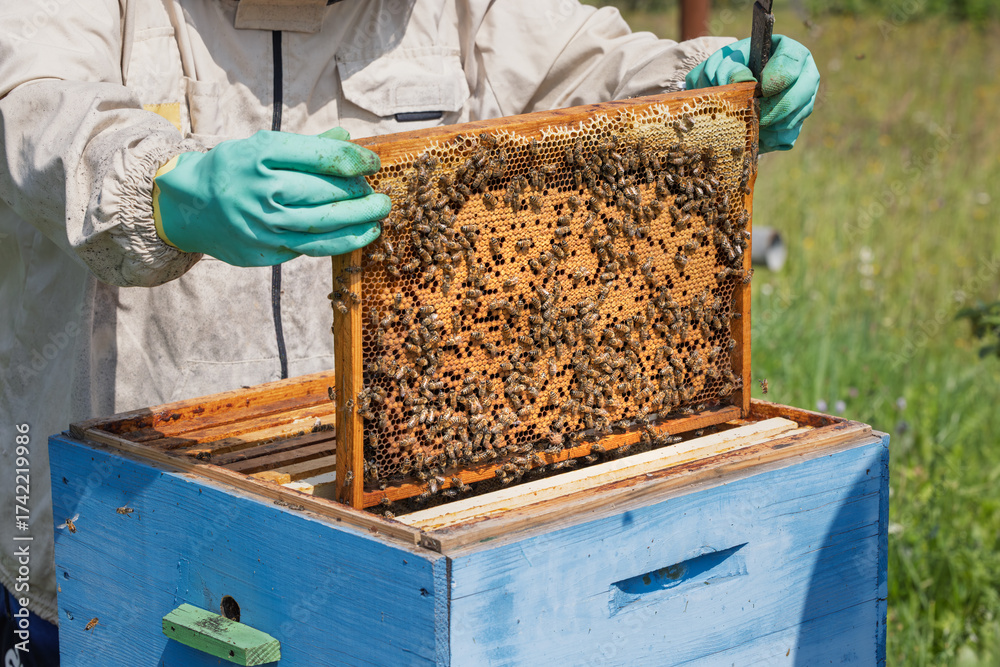 Beekeeper wearing a protective suit tending to beehives ensuring the well-being of the bees. Honey bees flying into wooden beehives.