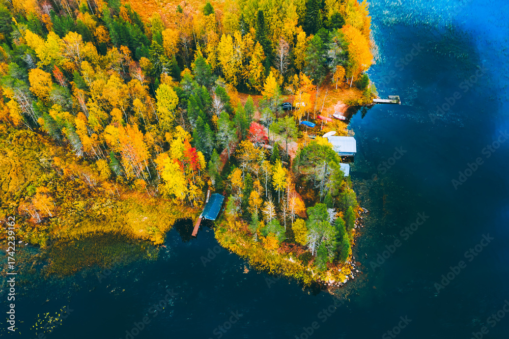 Aerial drone view of colorful tree woods island in blue lake or sea in fall season Finland.