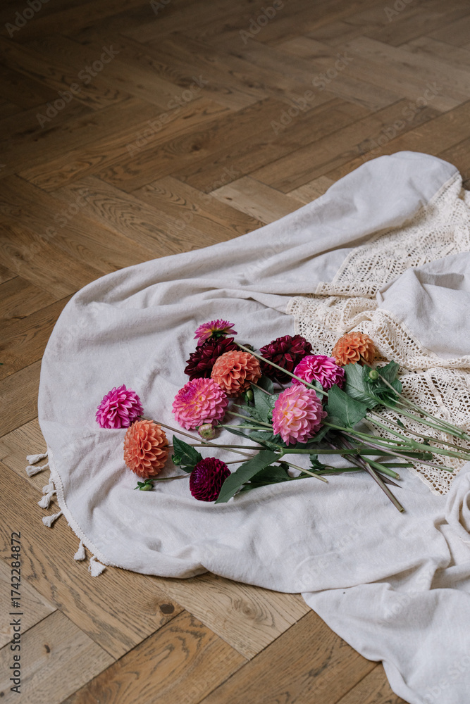 Bouquet of burgundy, pink and orange dahlias lying on linen fabric on a wooden floor, top view. Autumn aesthetic