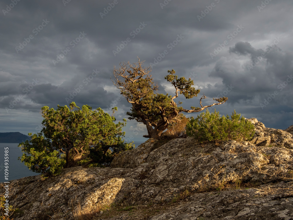 Woman's hand holding a glass with delicious vanilla milkshake with cookies and whipped cream against the background of golden garland lights
