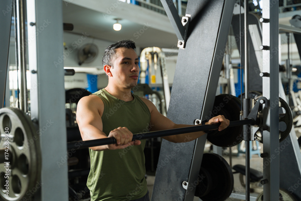 Man exercising using weight machine at gym