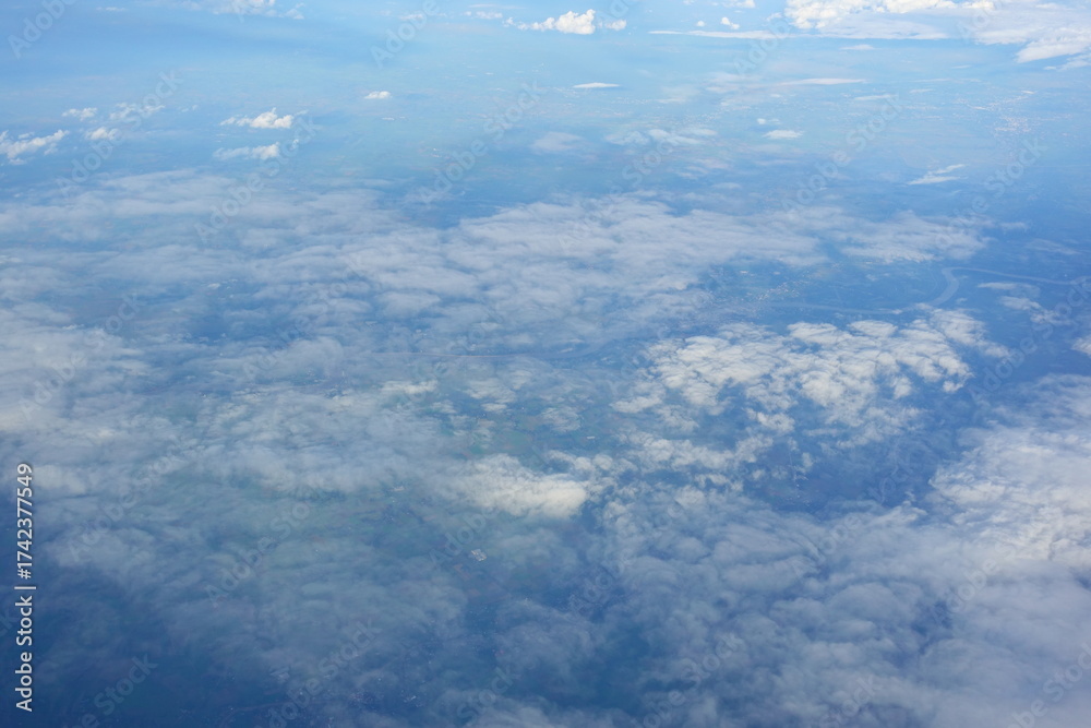 Beautiful white clouds drifting peacefully in the blue sky as seen from above or Layers of soft clouds stretching across the sky during a daytime flight.