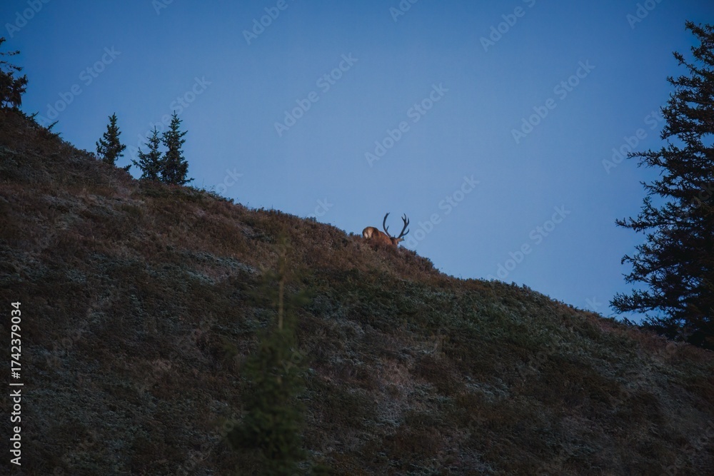 a red deer stag, cervus elaphus, on the mountains in the rutting season at a autumn morning