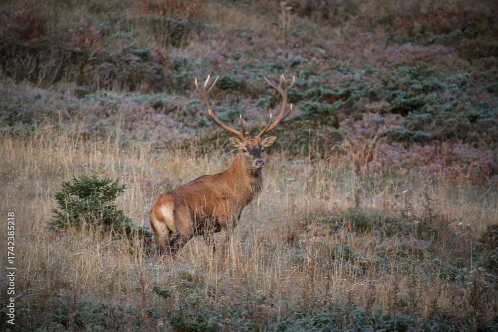 a red deer stag, cervus elaphus, on the mountains in the rutting season at a autumn morning