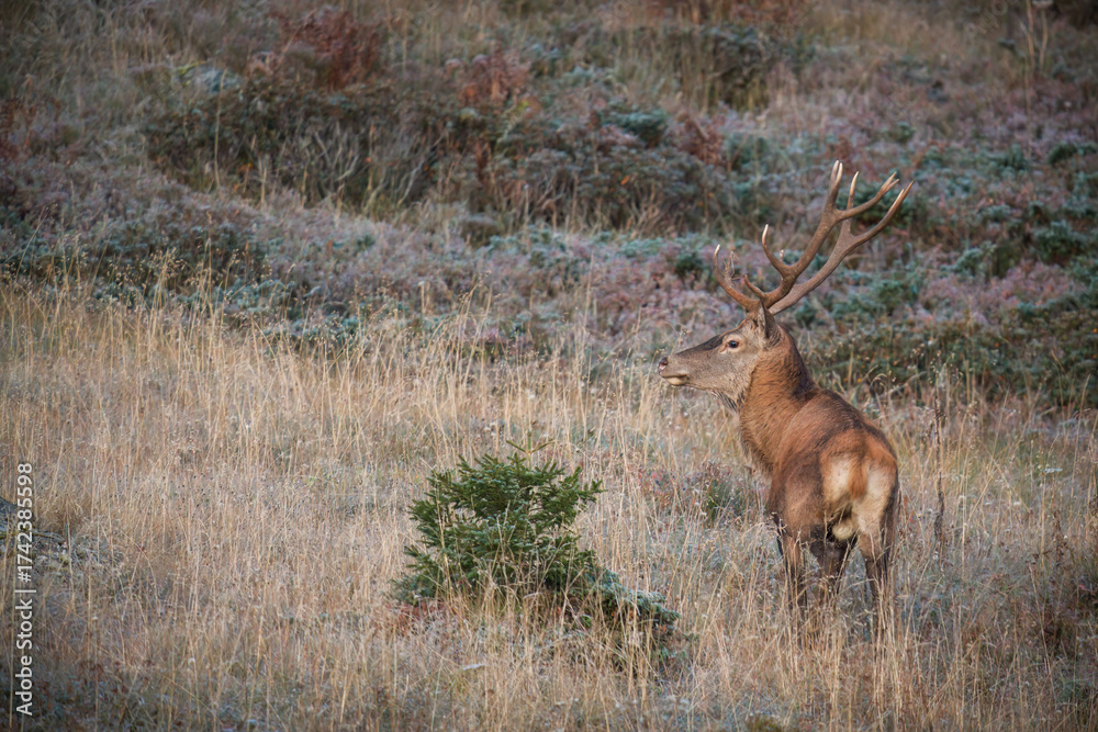 a red deer stag, cervus elaphus, on the mountains in the rutting season at a autumn morning