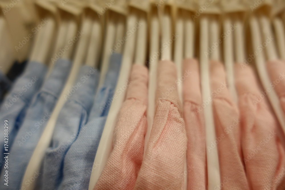 Soft pastel pink blue yellow cream baby clothes neatly arranged on white plastic hangers in a boutique store, highlighting delicate embroidery and gentle cotton texture for newborn girls.