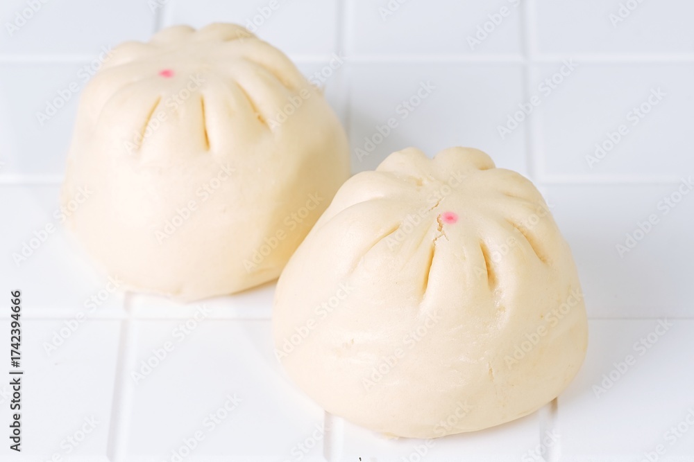 Two baozi buns served on white plate. Traditional Asian dim sum and snack bread. Popular breakfast dish in Asia