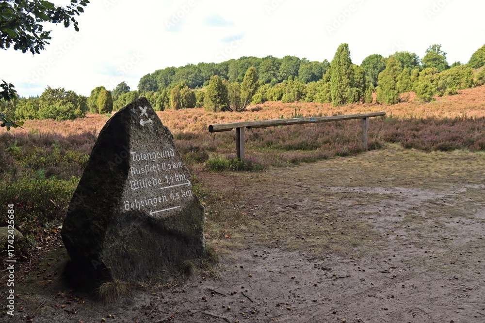 Blick auf den Totengrund in der Lüneburger Heide mit Wegweiser nach Wilsede und Behringen