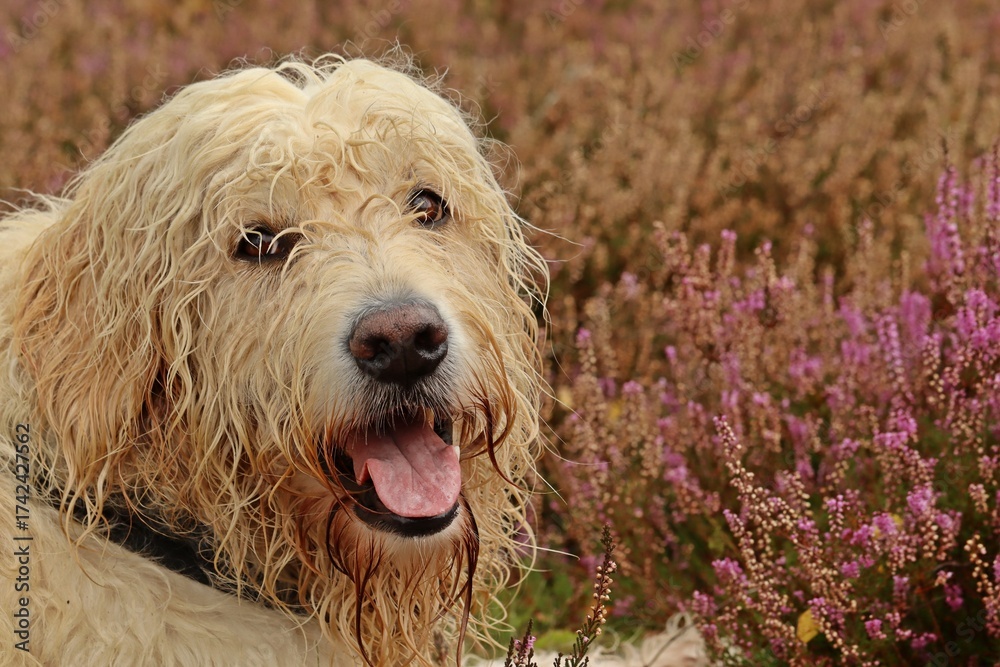 Goldendoodle im Büsenbachtal in der Lüneburger Heide
