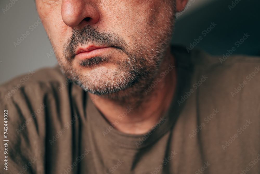 Closeup of mature adult man with stubble and serious expression, cropped face detail, thoughtful and introspective mood.