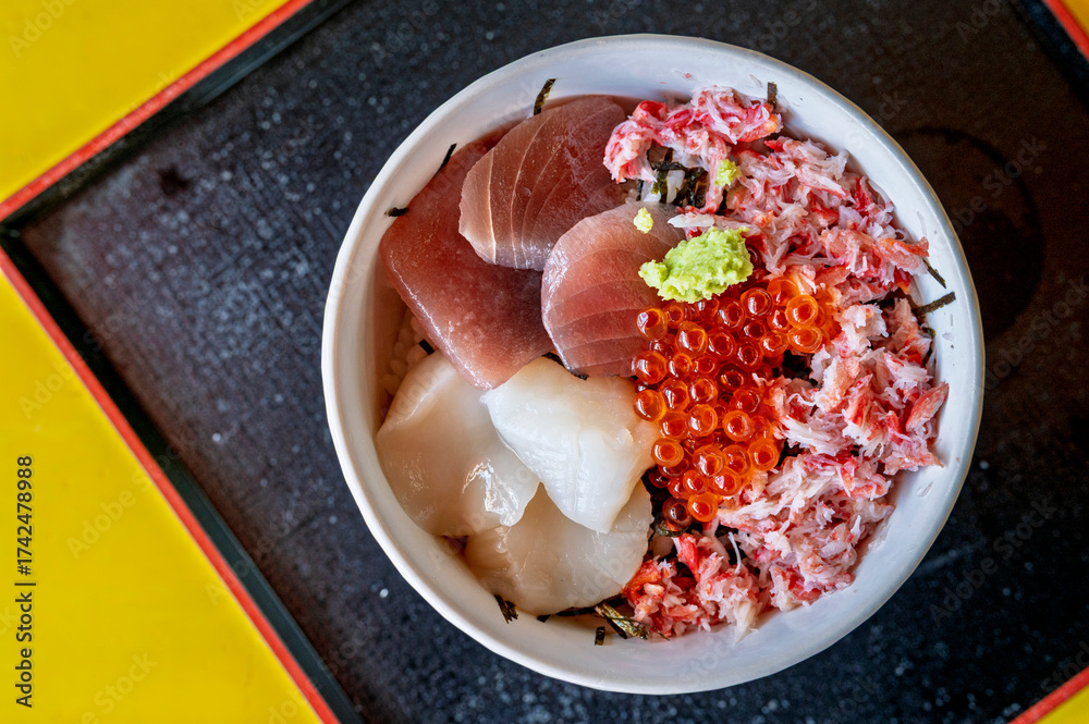 Japanese rice topped with hotate, snow crab, salmon sashimi, and salmon roe